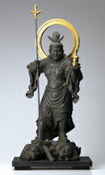 ※本体は一木彫り、光背・宝塔・槍・台は別彫り※一体一体手作りの為、大きさ、重量、色合いなど若干異なります。■素材:[本体]楠 [台座]木製■寸法(約):[本体]高さ76(槍含む)×幅30×奥行18cm[台座]高さ4×幅38×奥行23cm[総重量]7.5kg■木製台座つき■お届けに約2ヵ月かかります。■送料は1点につき1,575円(税込)をお申し受けます。■鎌倉幕府初代執権である北条時政(ほうじょうときまさ)発願の伊豆の名刹において、本尊阿弥陀如来とともに安置されているのが、木造毘沙門天立像。この像の胎内に納められていた塔婆形名札に日本が誇る大仏師「運慶(うんけい)」の名が記されていたことから真